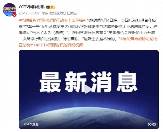 当地时间1月4日晚,美国总统特朗普在搭乘“空军一号”专机从佛罗里达州返回华盛顿途中再次威胁哥伦比亚总统佩特罗,称佩特罗“当不了太久(总统)”。在回答随行记者有关“美国是否会在哥伦比亚开展一次类似行动”的提问时,特朗普称,“这听上去挺不错的。”