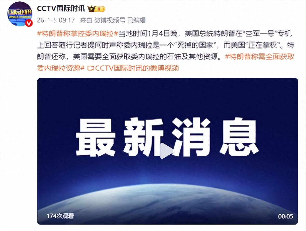 当地时间1月4日晚,美国总统特朗普在“空军一号”专机上回答随行记者提问时声称委内瑞拉是一个“死掉的国家”,而美国“正在掌权”。特朗普还称,美国需要全面获取委内瑞拉的石油及其他资源。