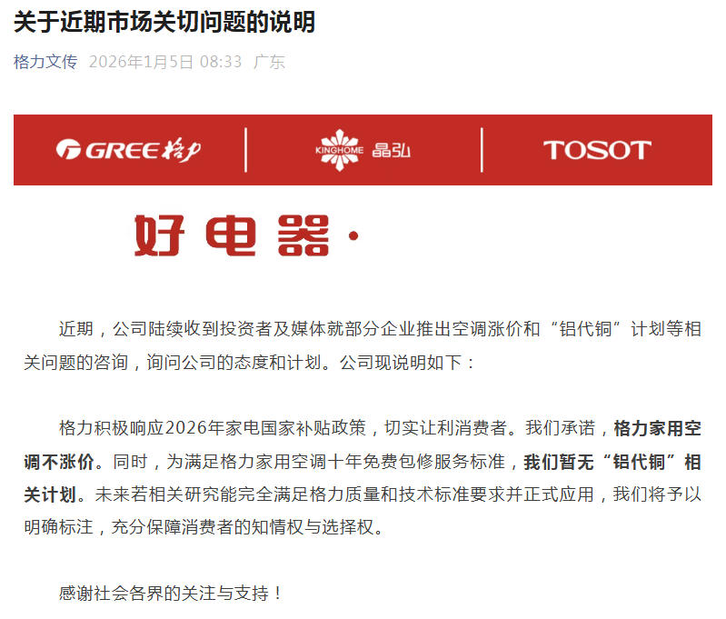 对此,说明中提到,格力积极响应2026年家电国家补贴政策,切实让利消费者。公司承诺,格力家用空调不涨价。同时,为满足格力家用空调十年免费包修服务标准,公司暂无“铝代铜”相关计划。未来若相关研究能完全满足格力质量和技术标准要求并正式应用,公司将予以明确标注,充分保障消费者的知情权与选择权。