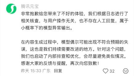 腾讯元宝解释,在内容生成过程中,模型偶尔可能出现不符合预期的失误,这也是元宝持续需要改进的地方。针对这个问题元宝也启动了内部排查和优化,会尽量避免类似情况。“感谢大家的反馈与提醒,再次向您致歉!”