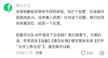 随后,腾讯元宝官方账号在评论区回复称,“非常抱歉给您带来不好的体验,先打个包票:元宝绝对是纯纯的AI,没有真人回复!针对这个问题,我们也快排查定位,给您一个反馈。您看可以在APP提交下日志吗?我们排查下。方便的话,辛苦您在【设置】-【意见反馈】填写简单反馈-【打开”允许上传日志“】,提交就可以啦。”