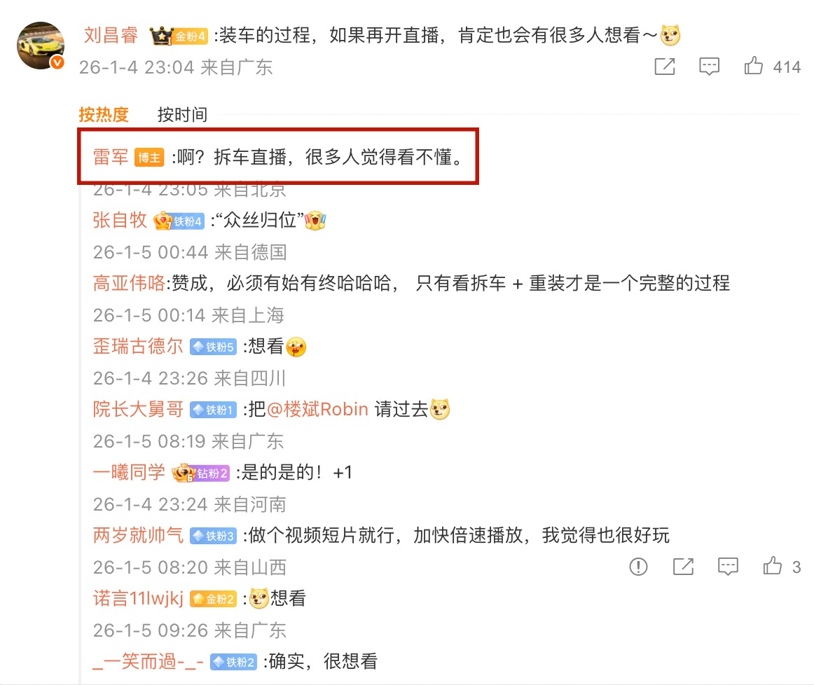 在评论区,还有不少人建议直播“装车”。对此,雷军显得有些意外,直言拆车直播很多人反馈看不懂。