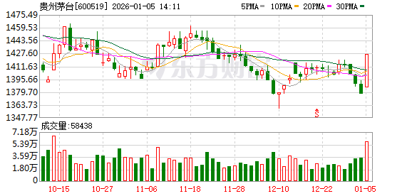 截至1月5日午间收盘,贵州茅台股价涨2.72%,报1414.60元/股,总市值1.77万亿元。