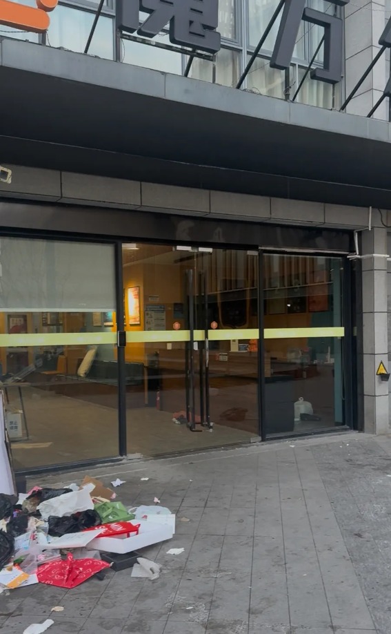 12月29日,魔方公寓(碧云国际店)大门紧闭,门口堆满垃圾,但屋内灯还亮着。