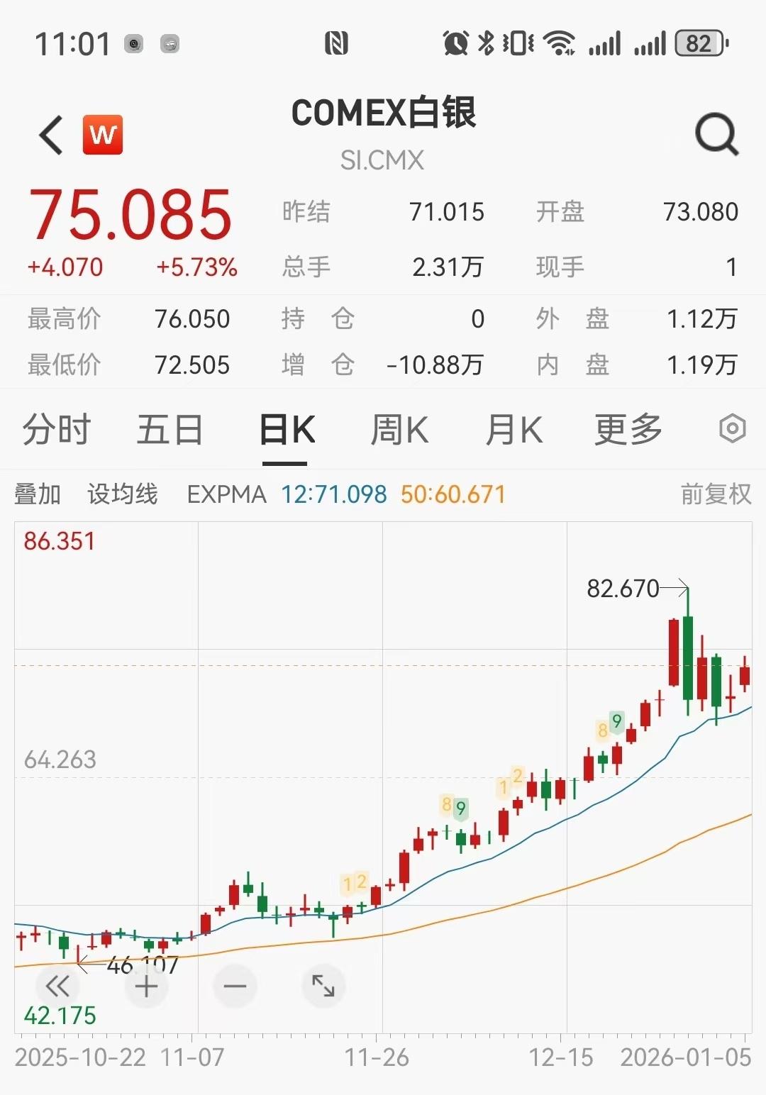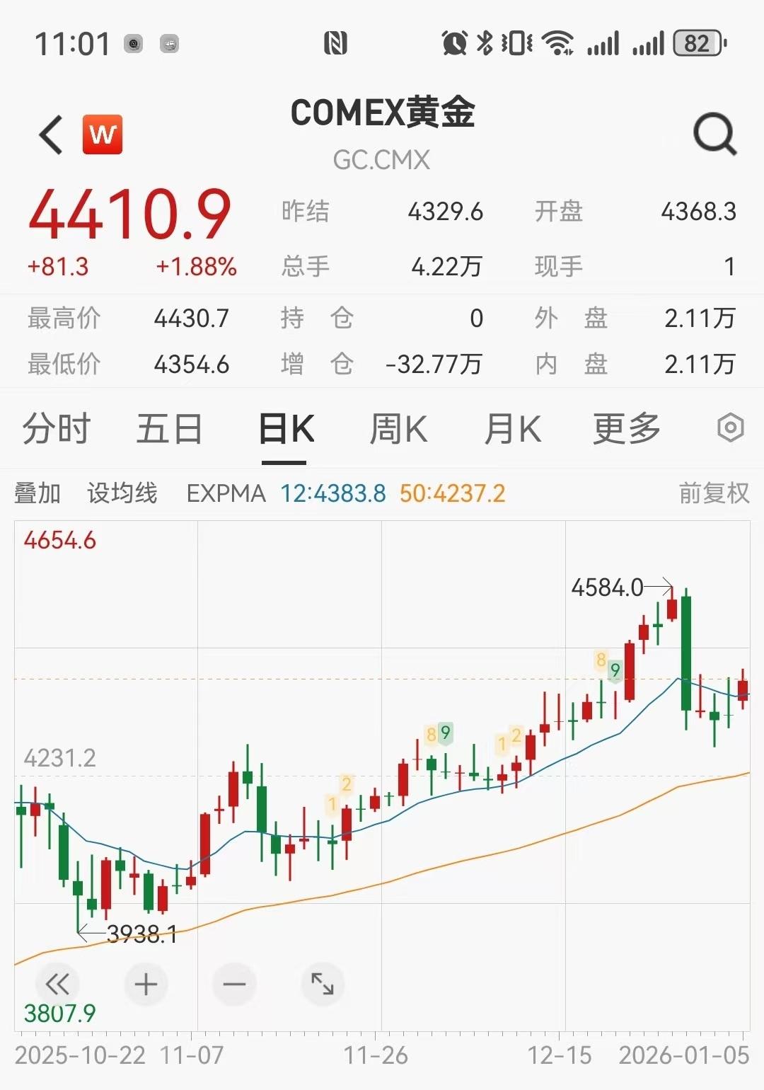 1月5日早盘,金银开盘直线拉升。截至11时02分,伦敦金现站上4400美元,高位报4419.81美元/盎司,日内涨幅0.81%,伦敦银现日内涨幅2.36%,COMEX黄金日内涨幅1.88%,COMEX白银涨幅5.73%。