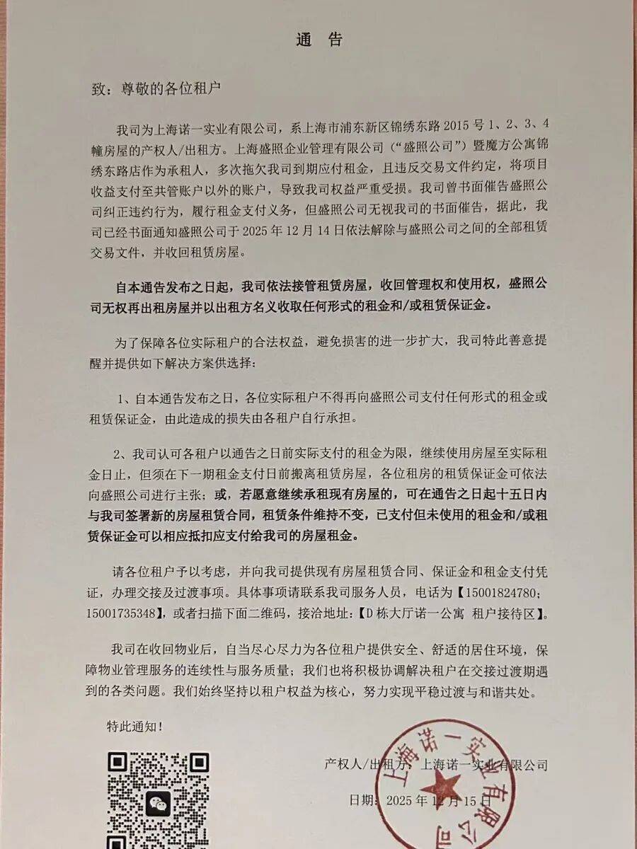 2025年12月4日,魔方公寓(锦绣东路店)的租客们发现,自己居住的楼栋各处都贴上了产权方发布的通告,产权方“上海诺一实业有限公司”(后简称“诺一”)入驻公寓前台,声称开始接管公寓。
