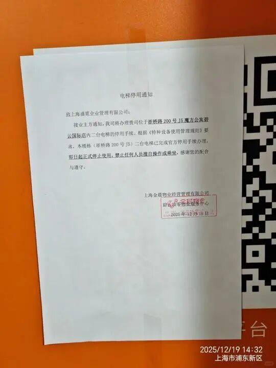 12月19日,魔方公寓(碧云国际店)电梯被强制停运。