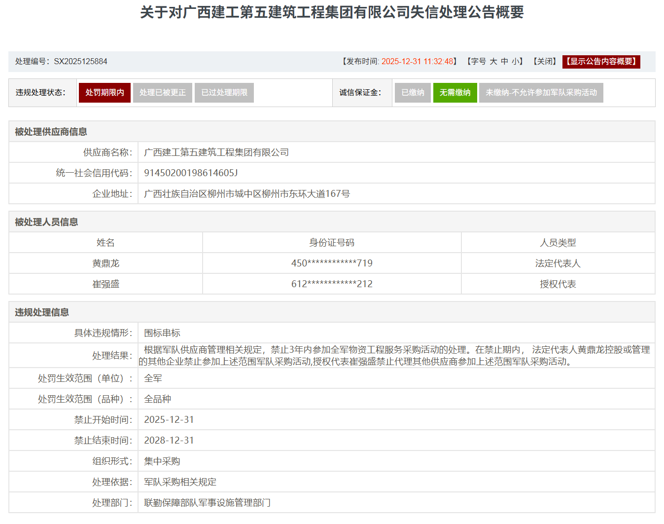近日,军队采购网信息显示,广西建工第五建筑工程集团有限公司因围标串标。被联勤保障部队军事设施管理部门根据军队供应商管理相关规定,禁止3年内参加全军物资工程服务采购活动的处理。在禁止期内, 法定代表人黄鼎龙控股或管理的其他企业禁止参加上述范围军队采购活动,授权代表崔强盛禁止代理其他供应商参加上述范围军队采购活动。处罚生效范围为全军、全品种。