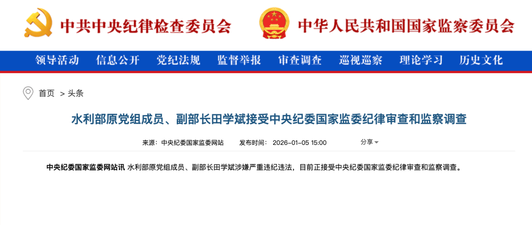 1月5日,中央纪委国家监委网站通报,水利部原党组成员、副部长田学斌涉嫌严重违纪违法,目前正接受中央纪委国家监委纪律审查和监察调查。