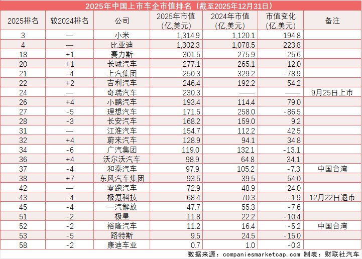 相较小米的加速“快跑”,比亚迪在过去一二年间年市值表现跌宕起伏——2024年6月,比亚迪全球市值曾一度反超大众集团,成为全球车企市值季军;2024年底,比亚迪被当时入局汽车市场不足一年的小米反超;2025年12月31日数据显示,比亚迪以1302.3亿美元市值位列第四位,仅次于小米的1314.9亿美元,大幅领先于通用、奔驰、宝马等外资车企。1月4日,比亚迪发布最新产销快报显示,2025年全年累计销售新能源汽车460.2万辆,同比增长7.73%。其中纯电车型225.67万辆,超越特斯拉的164万辆,登顶全球电动汽车销量榜。