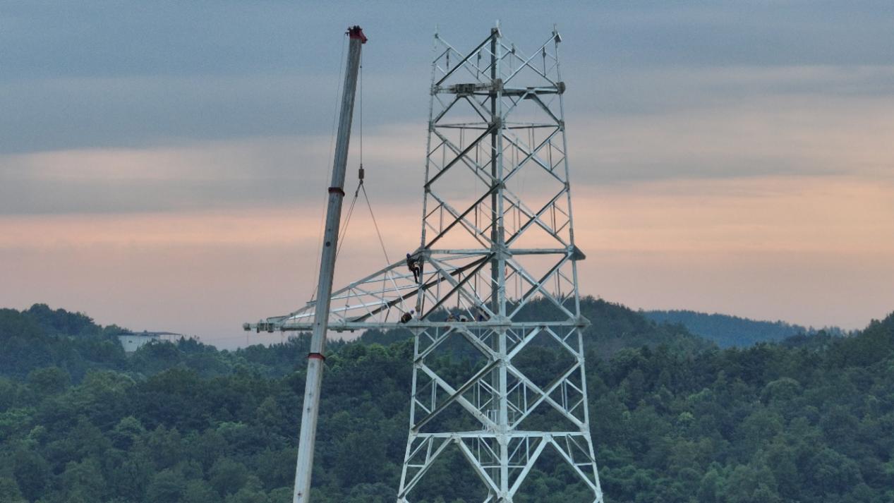 现场,一座座崭新的铁塔巍然耸立。电力工人们系着双保险安全绳,站在铁塔上,在寒风中进行附件安装作业。他们脚下,一条条银色导线在设备牵引下缓缓升起,横跨河谷、翻越山脊,将铁塔相连,勾勒出绿色清洁的能源动脉。