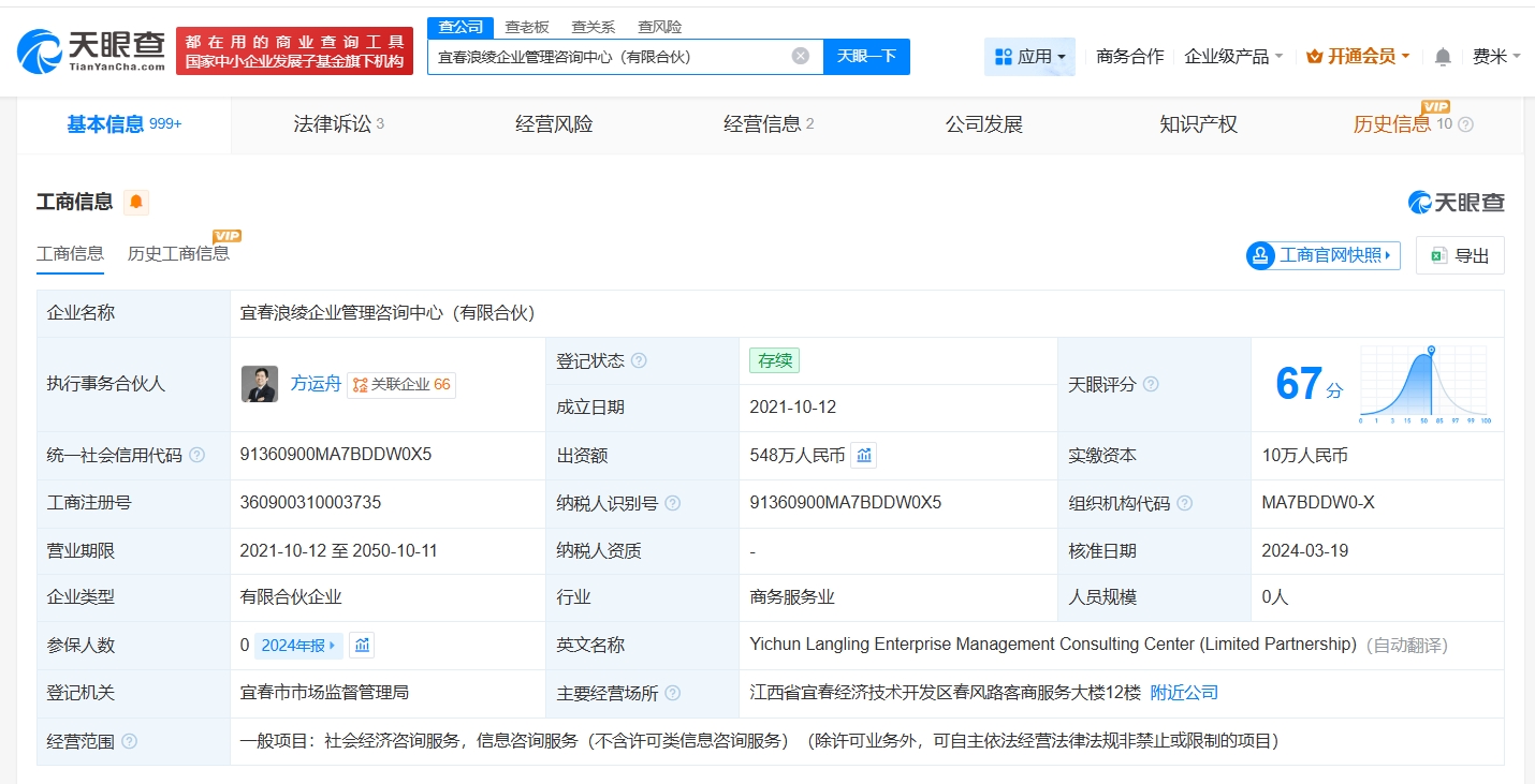 宜春浪绫企业管理咨询中心(有限合伙)成立于2021年10月,执行事务合伙人为方运舟,出资额548万元,经营范围为社会经济咨询服务、信息咨询服务。