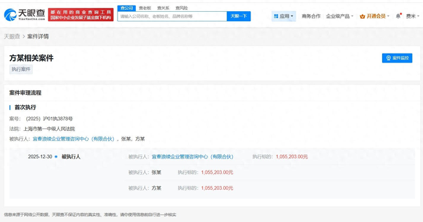 此前,2025年11月,天眼查天眼风险信息显示,方运舟、张勇、宜春浪绫企业管理咨询中心(有限合伙)新增两则被执行人信息,执行标的合计36.57万元,执行法院为上海市第一中级人民法院。