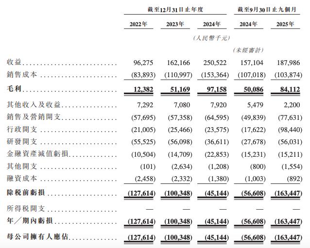 2025年前三季度净亏损进一步扩大,公司前9个月亏损为1.63亿元,上年同期的期内亏损为5661万元,同比下降65%。营收为1.88亿元,较上年同期的1.57亿元增长19.7%;毛利为8411万元,上年同期的毛利为5009万元。
