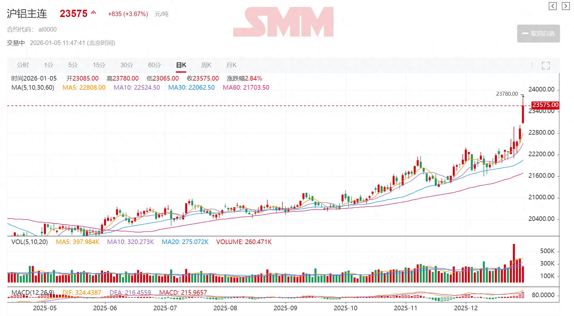 元旦假期归来首个交易日,沪铝主连在经历前6个交易日的接连上涨之后继续跳空高开,盘中一度涨逾4%,最高上探至23780元/吨,刷新2022年3月以来的新高。截至午间收盘,沪铝主连以3.67%的涨幅报23575元/吨。
