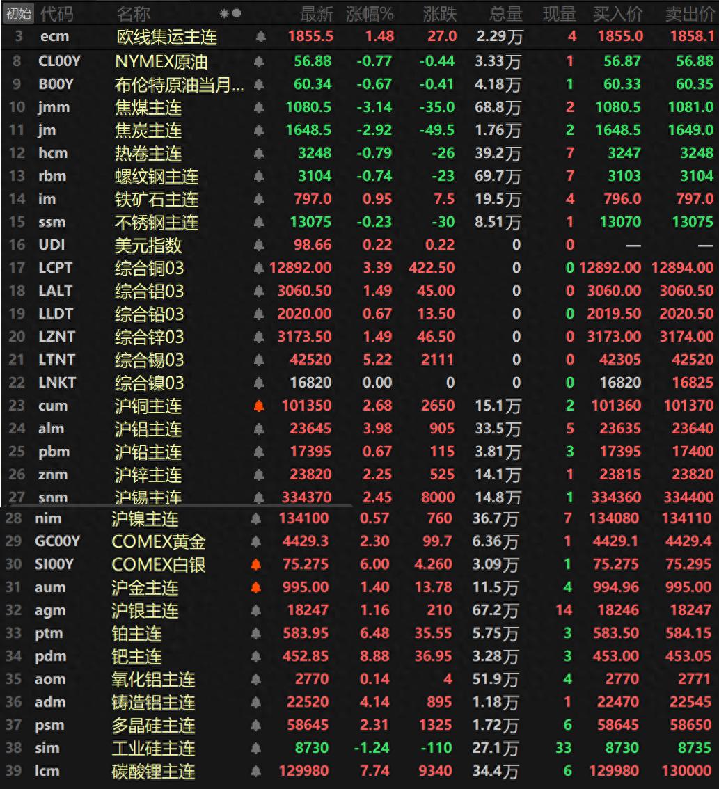 此外,碳酸锂主连涨7.74%,多晶硅主连涨2.31%,工业硅主连跌1.24%。欧线集运主连涨1.48%报1855.5。
