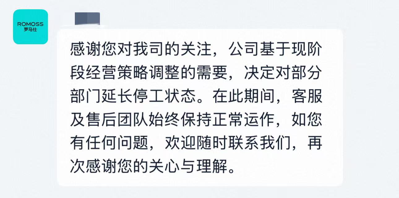 1月5日,记者就此事咨询罗马仕某电商平台旗舰店客服。该客服表示,公司基于现阶段经营策略调整的需要,决定对部分部门延长停工状态,在此期间,客服及售后团队始终保持正常运作。