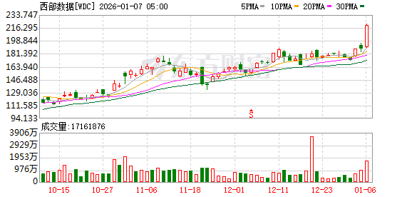 当地时间1月6日,美股存储板块狂飙,截至收盘,闪迪(SanDisk)大涨27.56%,为十个月以来的最大日内涨幅,美光科技涨超10%,再创历史新高。希捷科技涨14%、西部数据涨超16%。