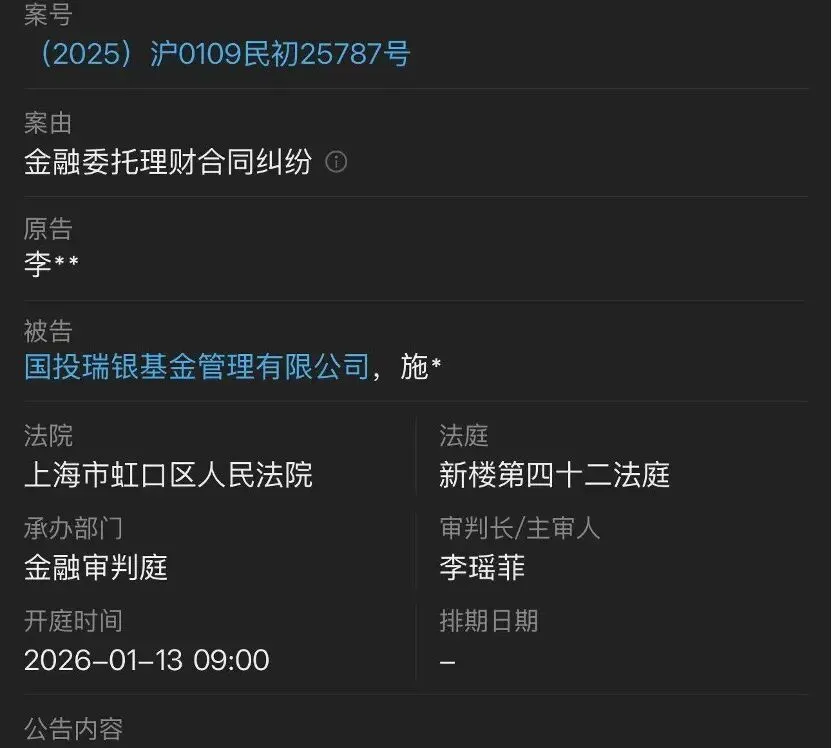 再来看国投瑞银基金,上海市高级人民法院开庭公告显示,日前,投资者李某以“金融委托理财合同纠纷”为由,把国投瑞银基金和施成一起告上了法庭。