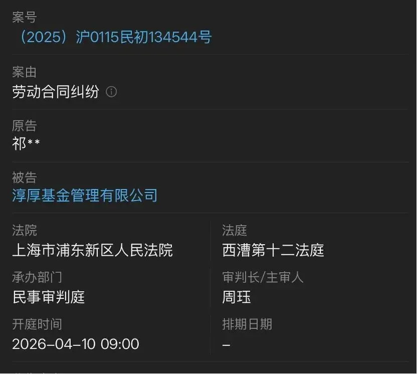 近日,企查查显示,淳厚基金新增一条司法案件信息,原告祁某某因劳动合同纠纷,起诉了淳厚基金,案件将于4月10日开庭。
