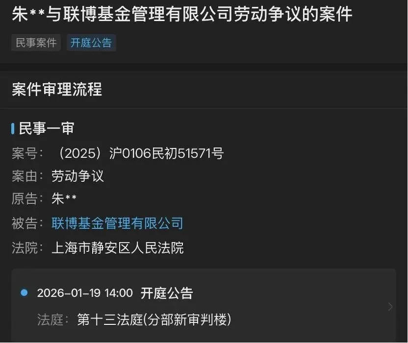 联博基金前副总经理朱建荣因劳动争议起诉了联博基金,在2025年9月4日,朱建荣因个人原因离任副总,并不再转任公司其他岗位。离职不足三个月,朱建荣就对老东家进行了起诉。