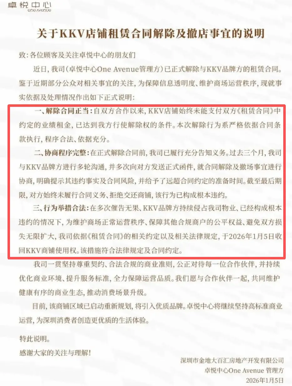 而到了2026年1月4日晚,卓悦中心方面对KKV门店进行强制清场。1月5日晚,“卓悦中心”微信公众号就此事发布说明,提及解除合同、协商程序等相关事宜。