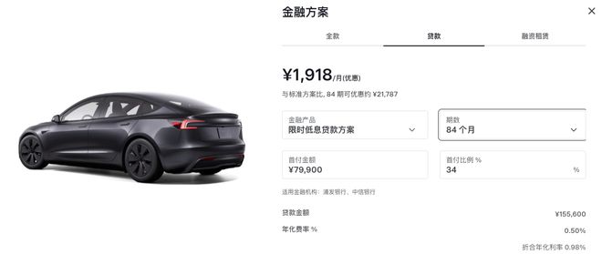 其中,Model 3首付7.99万元起,月供可低至1918元;ModelY首付7.99万元起,月供可低至2263元;Model Y L首付9.99万元起,月供可低至2947元。