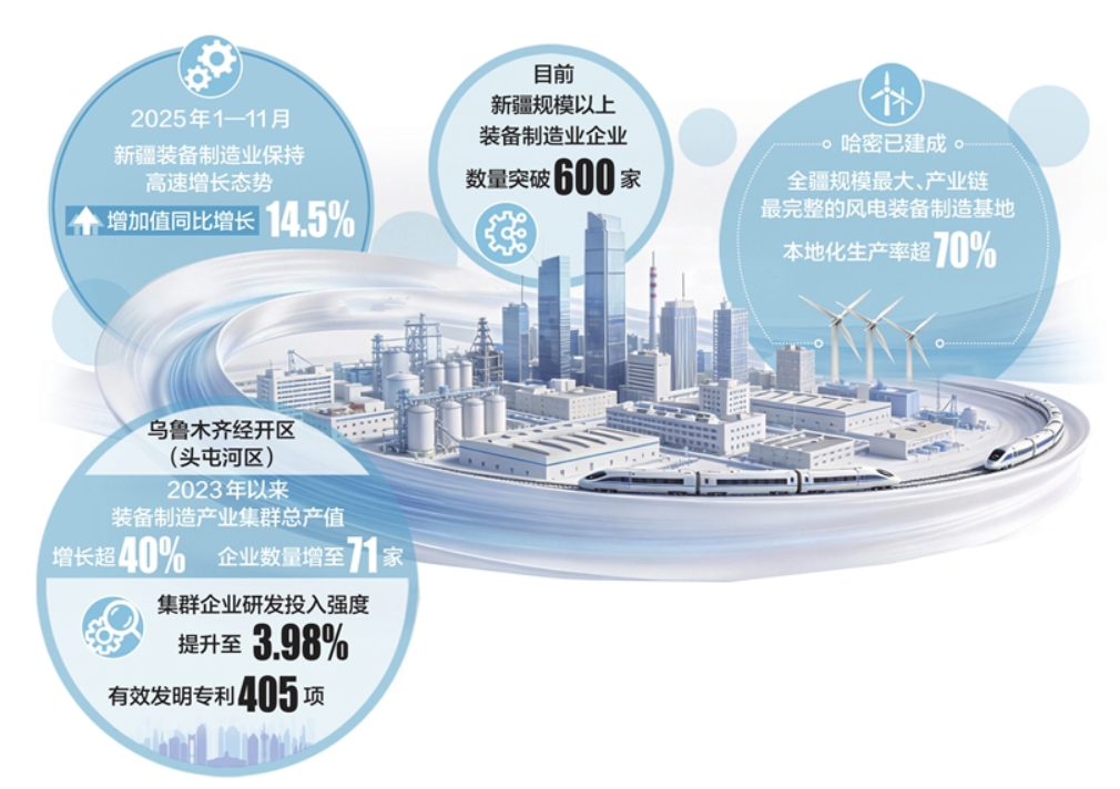 2025年1—11月,新疆装备制造业保持高速增长态势,增加值同比增长14.5%。目前,新疆规模以上装备制造业企业数量突破600家。