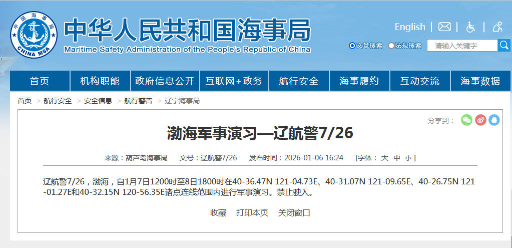 据中国海事局网站消息,葫芦岛海事局发布航行警告,自1月7日12时至8日18时,渤海部分海域进行军事演习,禁止驶入。