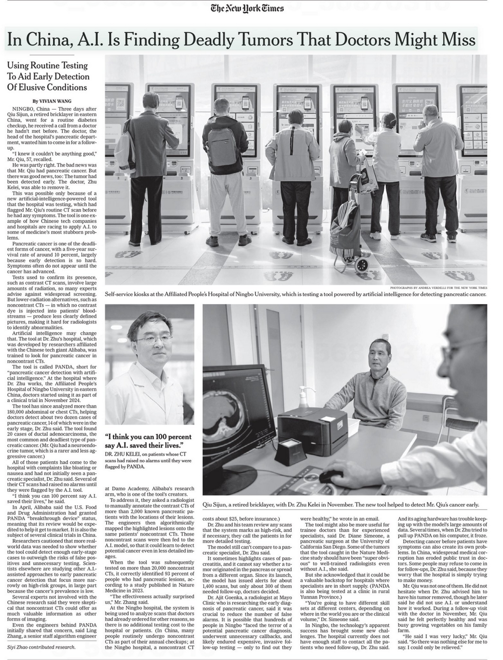 据中国网援引美国《纽约时报》,当地时间1月2日,后者整版报道介绍了阿里巴巴研发的胰腺癌早筛AI模型——57岁的邱先生因腹胀、恶心等症状去医院,在宁波大学附属第一医院进行常规糖尿病检查时接到电话通知:阿里巴巴达摩院开发的AI模型从他的平扫CT片里发现了早期胰腺癌。