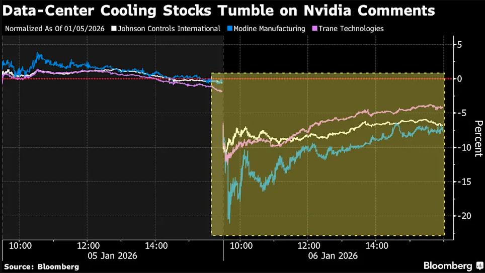 在有人因黄仁勋的演讲“欢喜”的同时,自然也有人“发愁”——制冷系统制造商的股票在周二就普遍遭到了抛售。