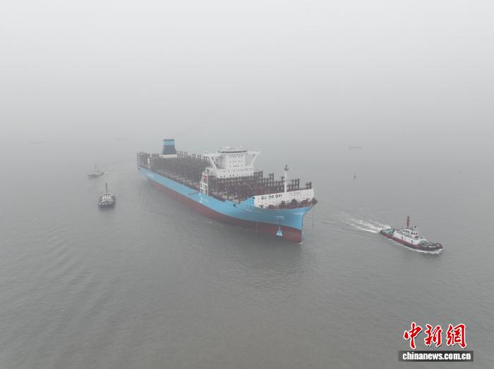 长江干线2026年首艘超大型新造集装箱船“新扬子536”轮6日从江苏泰州离港出江,前往东海指定水域试航。