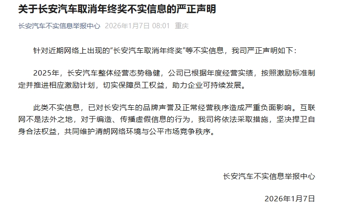 “长安汽车不实信息举报中心”微信号7日发布声明指出,针对近期网络上出现的“长安汽车取消年终奖”等不实信息,公司严正声明如下: