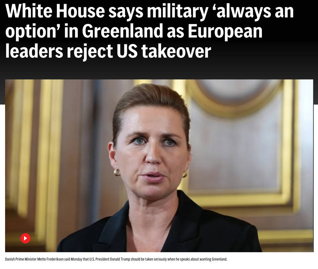 至于军事选项,这在现实政治上几乎等同于把美国推到与盟友体系对撞的位置。白宫口头上保留军事选项,更多是为了最大化谈判筹码,这也是为什么鲁比奥在国会急着降温,说明政府内部也清楚,一旦外界把美国当成真要动武,那么,市场、盟友与国内政治的反噬会很快到来。目前,丹麦首相已直言,对格陵兰岛的攻击意味着北约终结,欧洲多国领导人也在联合声明中重申“捍卫丹麦和格陵兰岛的主权”,这意味着军事路径在现实中不仅成本高昂,而且会在政治上把美国推向前所未有的孤立。