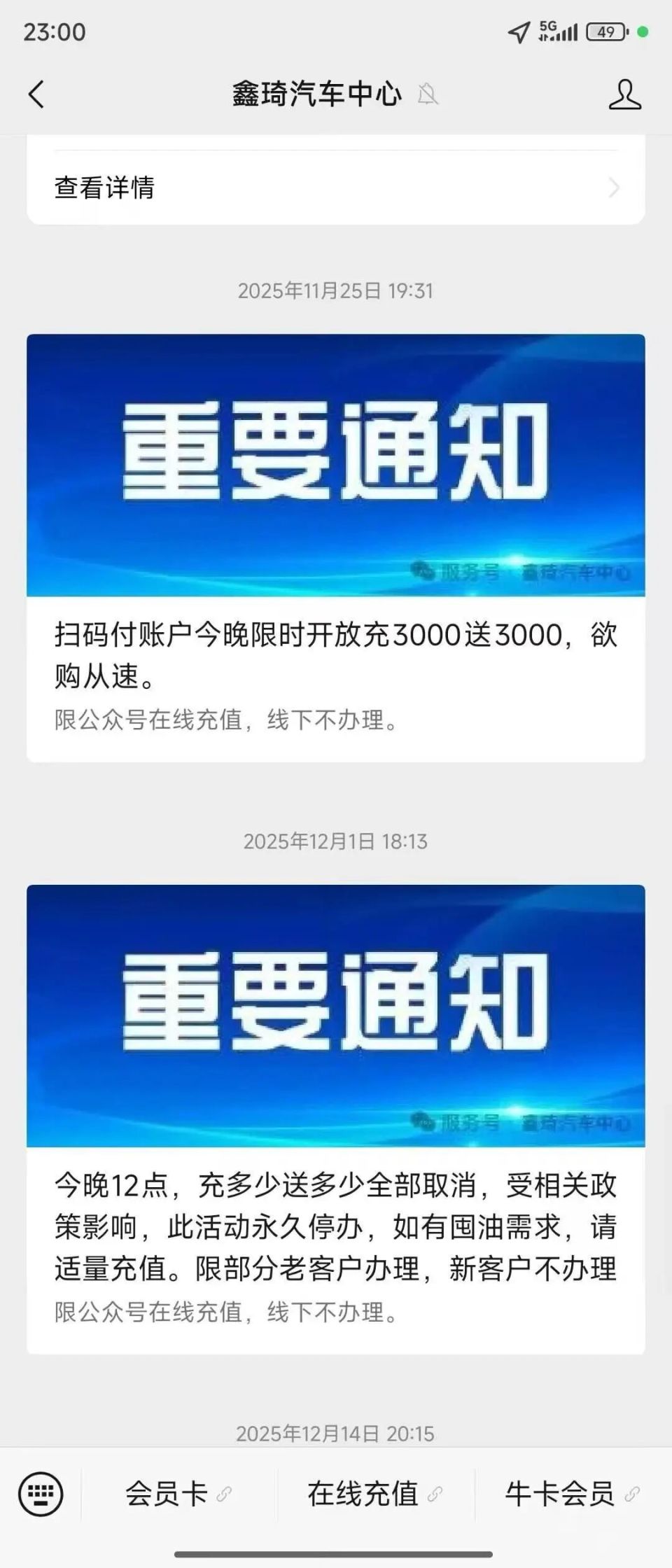 从2025年11月开始,加油站不断推送促销活动通知,通知中出现“限时开放”“今晚12点,充多少送多少全部取消,受相关政策影响,此活动永久停办”等话术,吸引消费者大额充值。