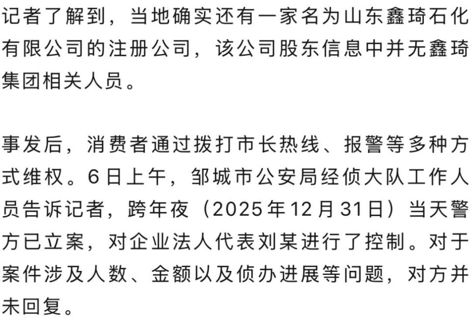 记者搜索发现,山东鑫琦实业集团有限公司是邹城当地一家大型民营企业,于2009年成立,注册资本1.7亿元,产业涉及地产开发、商业物流、医养康养、文化旅游等多个领域。鑫琦加油站与该集团同名,消费者自然将两者关联。