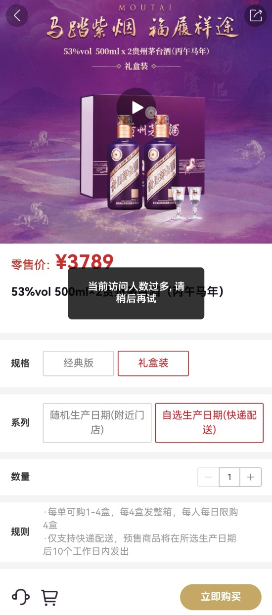 1月6日、7日上午9点,澎湃新闻记者实测发现,“新马茅”经典版、礼盒装依然遭到“疯抢”。其中,按照“随机生产日期”方式购买的产品,开售后迅速售罄,而按照“自选生产日期”方式购买的产品,页面频频弹出提示“当前访问人数过多,请稍后再试”,记者多次尝试后看到,目前开放的可自选的生产日期主要为1月和2月。