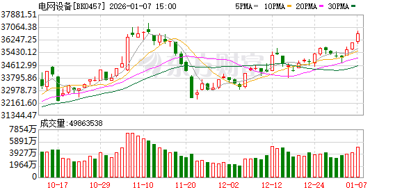 除了中国西电以外,1月7日三变科技(002112.SZ)、远东股份(600869.SH)、和顺电气(300141.SZ)等电网设备个股大涨,截至收盘,申万电网设备指数收涨1.88%,创逾一个月新高,距离历史高点只差5%。