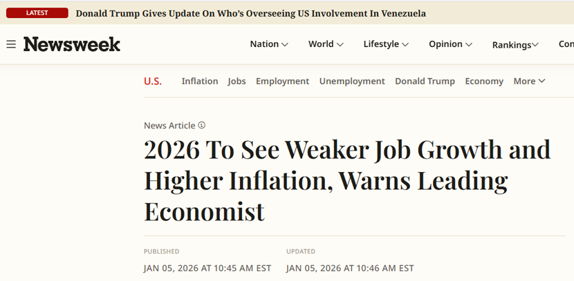 他还预测,2026年美国平均每月新增就业岗位数量,将从2025年的约12.5万个下降到4.9万个,失业率将从4.3%升至4.6%,而年度通胀率预计将从2.9%升至3.1%。