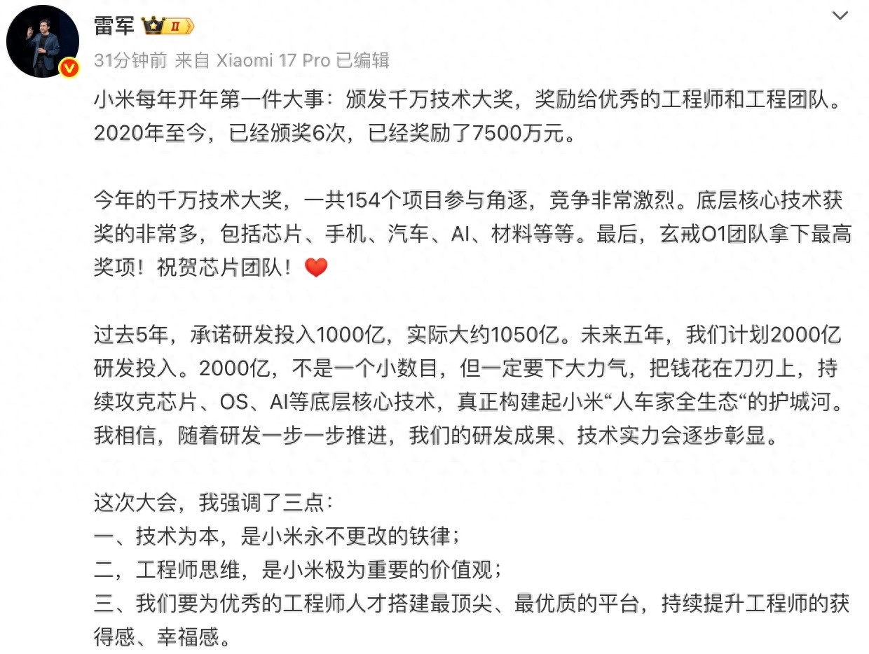 1月8日,小米集团董事长雷军通过个人微博披露,公司近期在内部颁发了千万技术大奖,一共154个项目参与角逐,包括芯片、手机、汽车、AI、材料等,最终玄戒O1团队拿下最高奖项。2020年至今,小米已颁奖6次,累积奖励7500万元。
