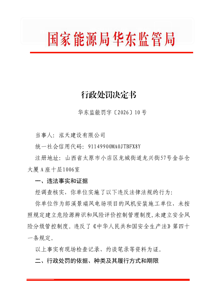 近日,国家能源局华东监管局对泓天建设有限公司开出行政处罚决定书。