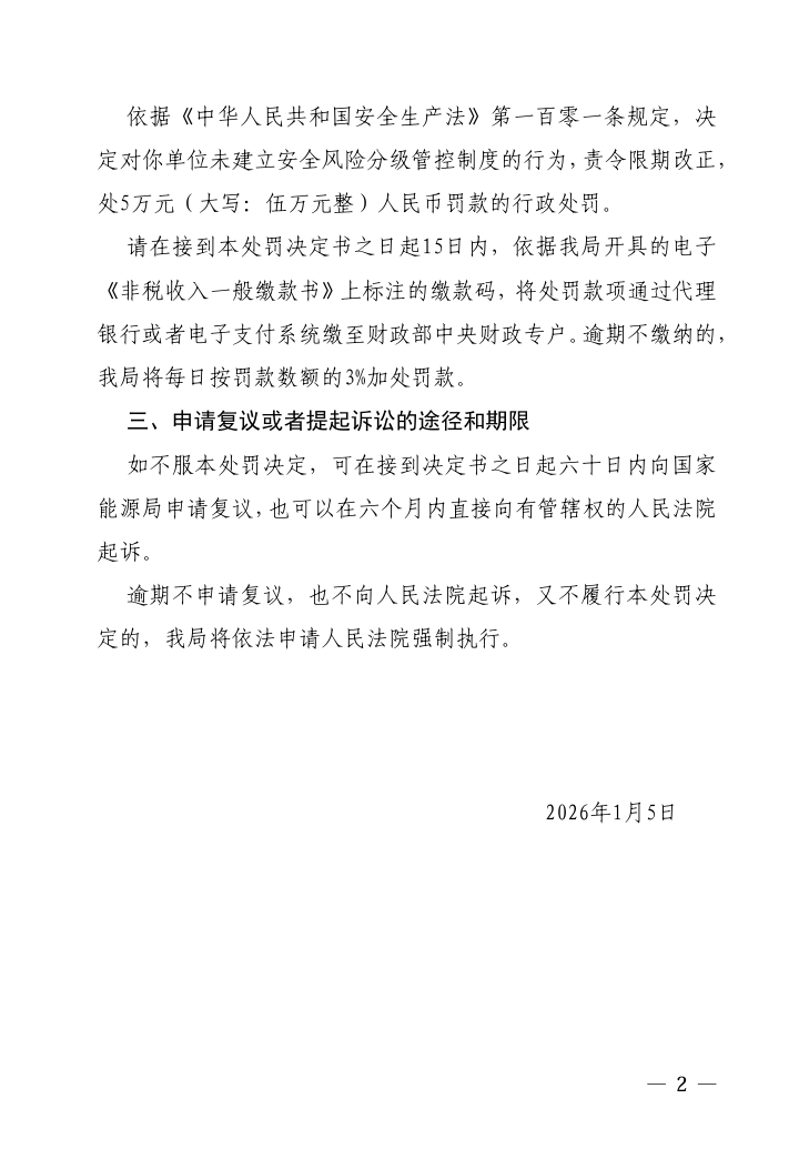 根据公告,泓天建设有限公司作为郎溪景瑞风电场项目的风机安装施工单位,未按照规定建立危险源辨识和风险评价控制管理制度,未建立安全风险分级管控制度,违反了《中华人民共和国安全生产法》第四十一条规定,华东能源监管局决定对该公司未建立安全风险分级管控制度的行为,责令限期改正,处5万元罚款的行政处罚。
