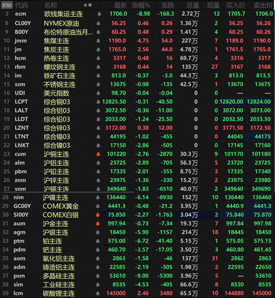 此外,碳酸锂主连涨2.46%,工业硅主连跌4.53%,多晶硅主连以9%的跌幅跌停,报53610元/吨。欧线集运主连跌8.98报1706。
