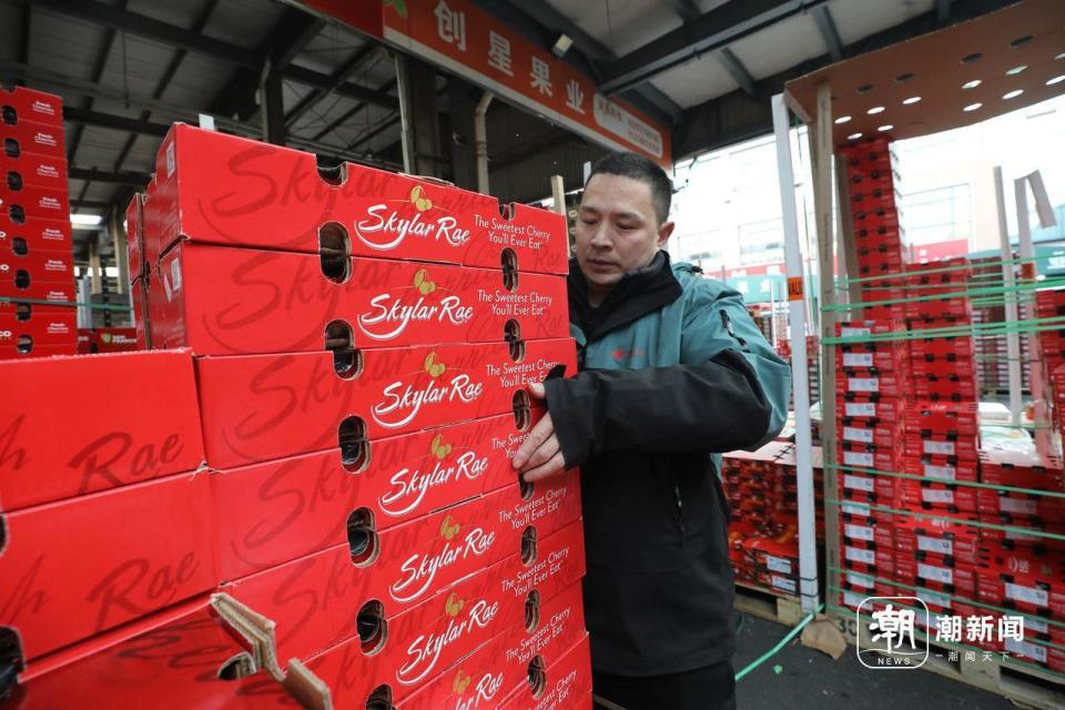 元旦期间,金冠楠的水果档口日销车厘子2000箱以上。潮新闻 记者 王嘉楠 摄