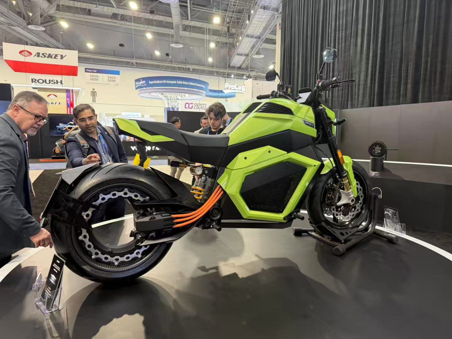 他指向展位中心的一辆摩托车对记者说,几个月内搭载该电池的Verge摩托车就会交付给用户。该摩托车的售价是35000美元。所有原本订购的顾客以为配备的是锂电池,但现在会为他们提供升级为全固态电池的选项。