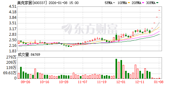 但在二级市场,美克家居股价表现火爆。自1月5日起,公司股票连续四个交易日一字板涨停,累计涨幅达46.23%。