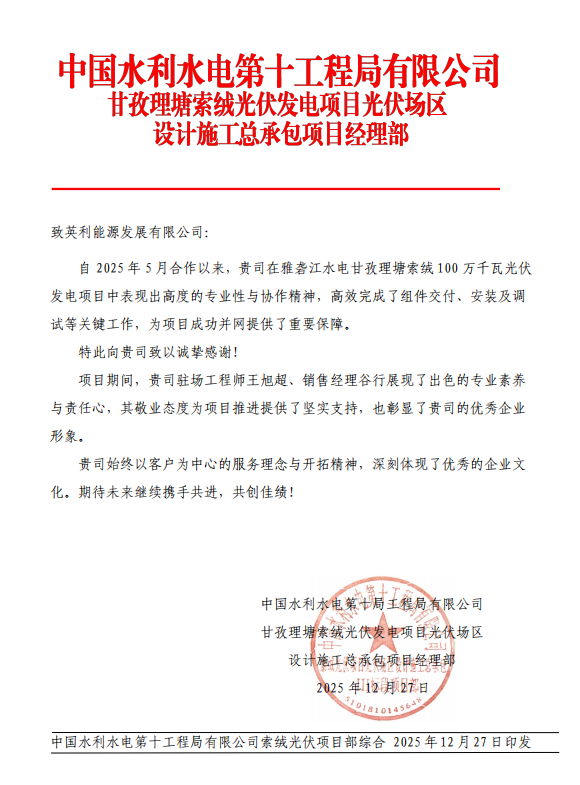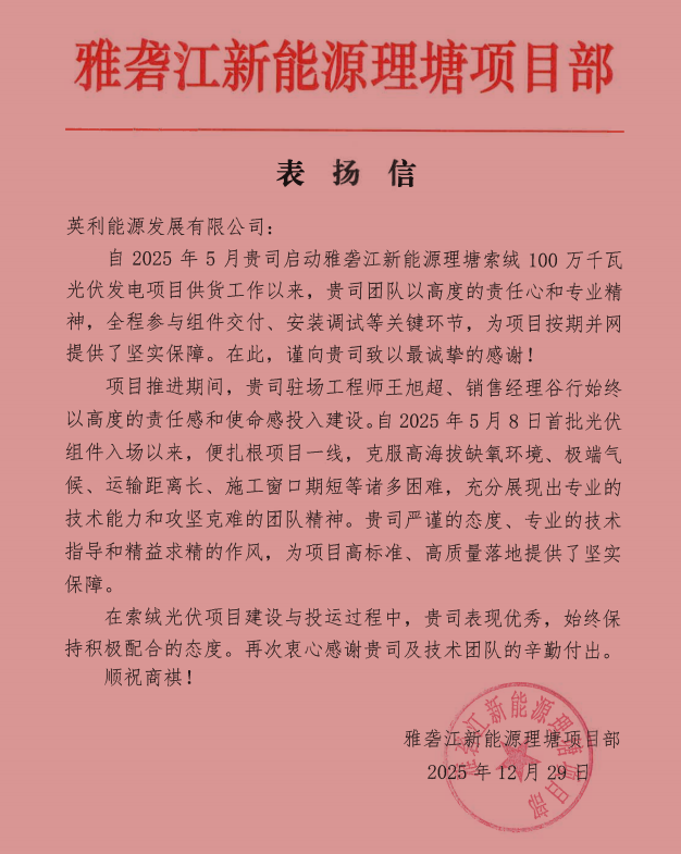 由于产品质量过硬、服务全面效率高,英利团队收获了来自业主的多封表扬信和锦旗。