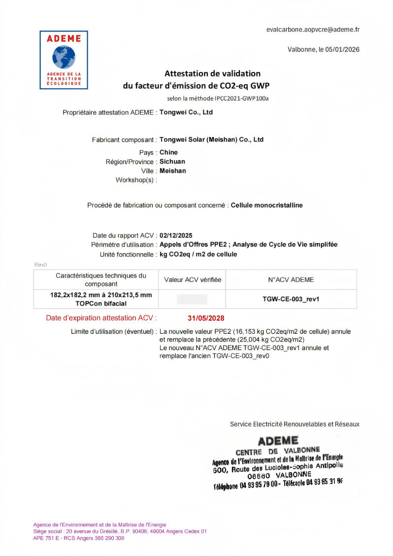 近日,通威太阳能(眉山)有限公司顺利通过法国环境与能源管理署(ADEME)核查,TOPCon产品成功获得法国碳足迹认证证书。该认证的取得,依托眉山公司灯塔工厂的高标准智能制造与可持续管理体系,体现了通威太阳能在产品全生命周期碳排放管理方面的持续深化与实践成果。