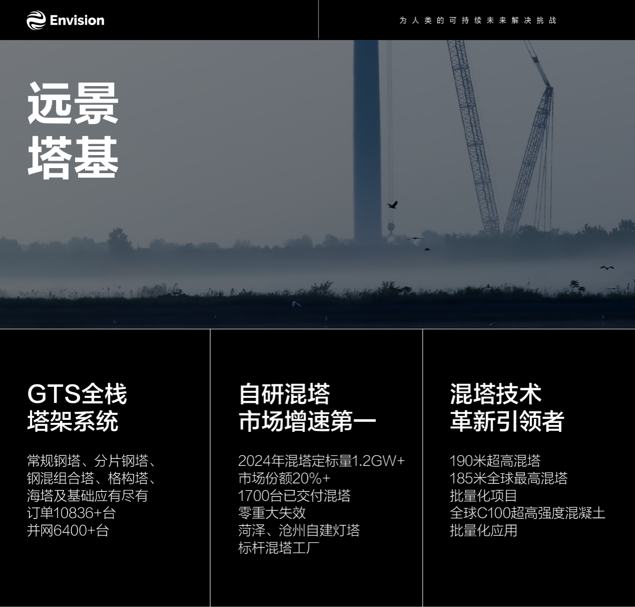 在混塔领域,2024年远景自研混塔定标量已超1.2GW,市场份额突破20%,实现市场增速第一,已交付的1700台混塔保持零重大失效。目前,远景在菏泽、沧州均自建 “灯塔工厂”,为混塔制造树立了行业标杆,形成了高效、智能、可复制的生产模式。作为混塔技术革新的引领者,远景成功打造了全球最高的190米混塔,并实现185米混塔的批量化交付;率先在全球范围内实现C100超高强度混凝土的批量化应用,不仅突破了材料和工艺的极限,也显著提升了塔架的结构性能和寿命。