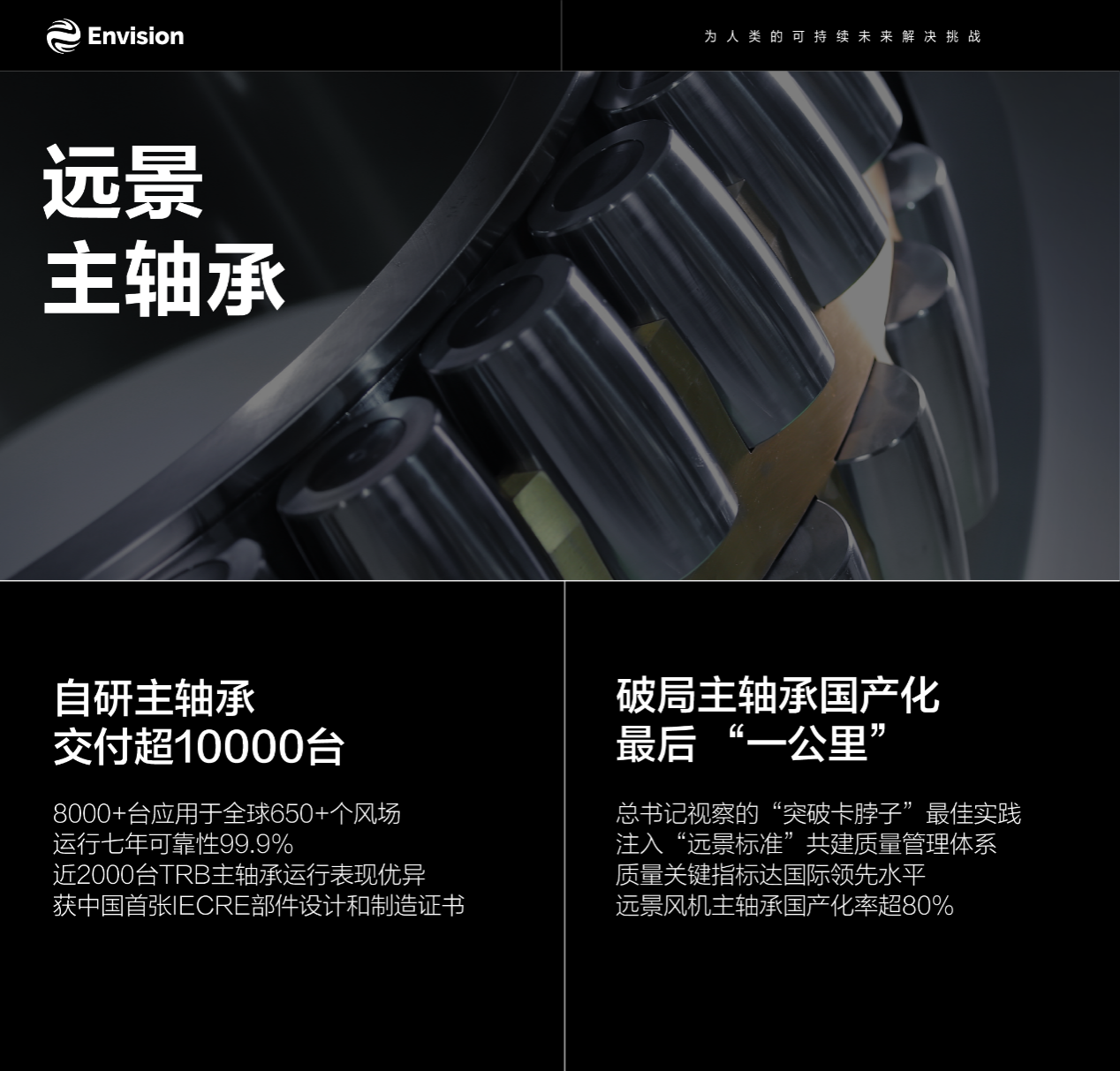 远景主轴承代表中国制造业最高水平,位居全球第一梯队。2025年,远景自主研发的主轴承累计交付超10000台,超8000台已稳定运行在全球650多个风场,运行六年可靠性99.9%,其中近2000台TRB主轴承已批量应用于海上与陆上大兆瓦平台机组,在温控表现、油脂寿命与振动控制等关键指标上表现优异,解决行业痛点“跑圈”问题,获得国际权威认证机构DNV颁发的IECRE认证证书,是首家获此认证的国产主轴承品牌,成功将机组可靠性提升至新高度。